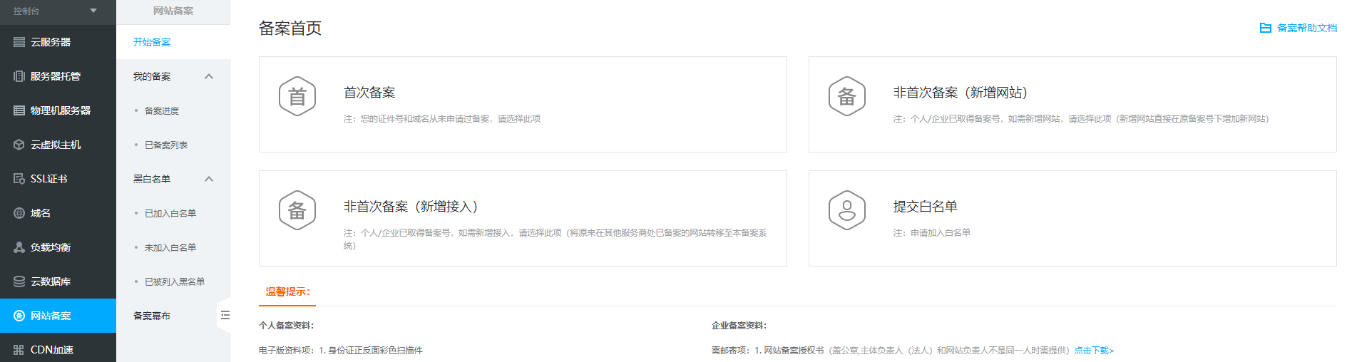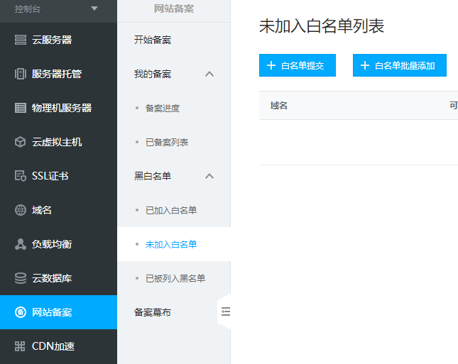 2、左边框栏点击网站备案,选择开始备案,在页面中选择提交白名单。 ![]() ![]() ![]() ![]() |